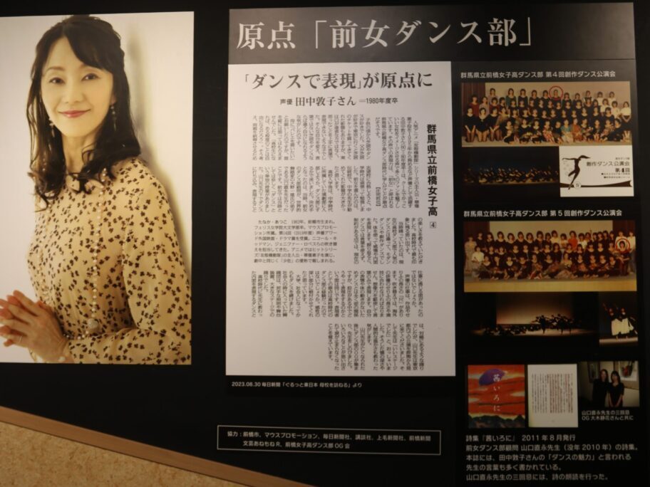人気アニメ「攻殻機動隊」のヒロイン、草薙素子役を30年務め、2024年8月に急逝した前橋市出身の声優、田中敦子さんを偲ぶ追悼展がJR前橋駅北口の歴史エンターテインメント施設「ヒストリア前橋」で開かれている。8月24日には田中さんの後輩にあたる前橋女子高校ダンス部が追悼演舞を行い、大先輩の功績に光を当てる。8月31日まで。
