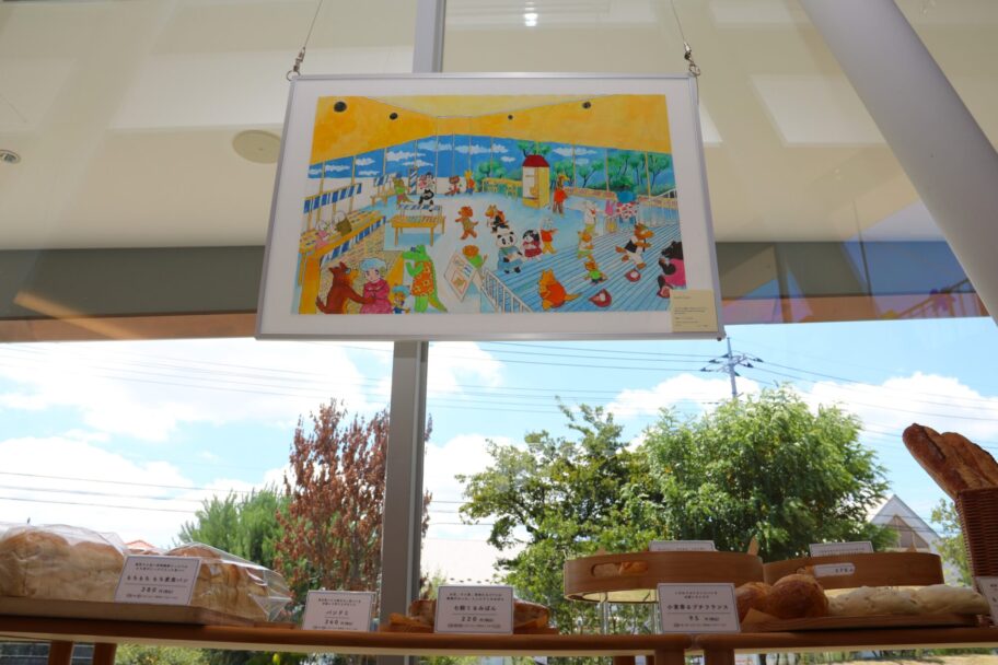 ▲パンと一緒に飾られているジンズパーク内を描いた作品