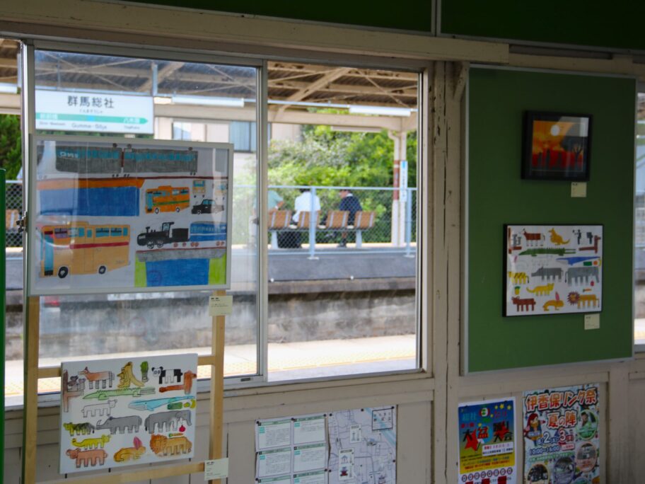 JR群馬総社駅の待合室。電車の時間を待つ間、利用客が画用紙に色鉛筆やペンを使って描いた絵を観賞している。駅らしく、電車や貨物、モノレールといった乗り物を描いた作品が多い。
