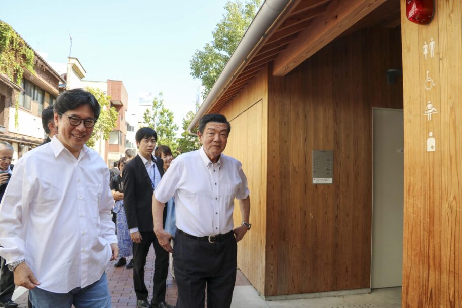 太陽の会の寄付金をもとに親水デッキが作られ、レンガ敷きとなった馬場川通りを歩き、「いいですね。市民の名前がレンガに彫られていて」と感心。白井屋ホテルの一室のデザインを手掛けた世界的なプロダクトデザイナー、ジャスパー・モリソンがデザインした公衆トイレに驚いていた。