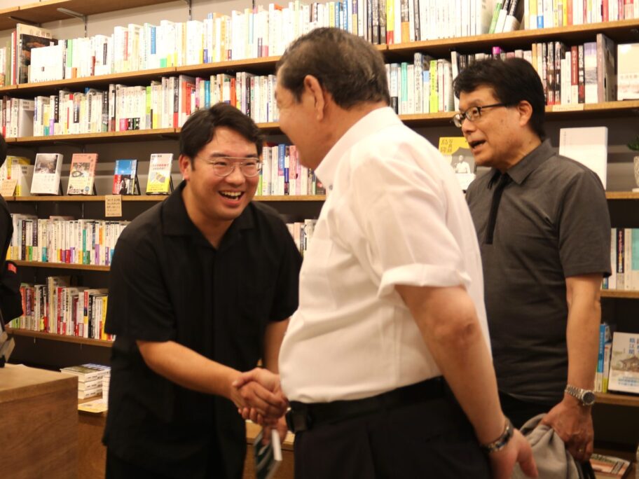 「全国の書店経営者を支える議員連盟(書店議連)」の事務局長を務めており、中央通りに7月に開店した書店「水紋」に立ち寄った。脱サラしUターンして起業した小澤亮太さんに「大変だろうが頑張って。まちから本屋さんがなくなったら大変だから」とがっちり握手した。
