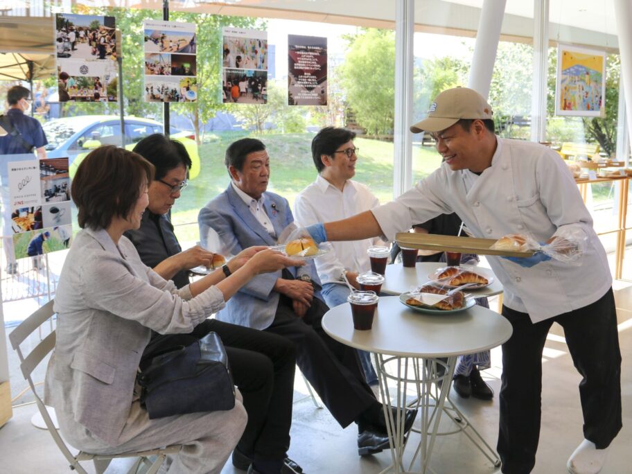 パーク内で販売している焼きたてのパンを食べながら、地域の課題解決をビジネスと結び付けるジンズの取り組みについて説明を受けた。