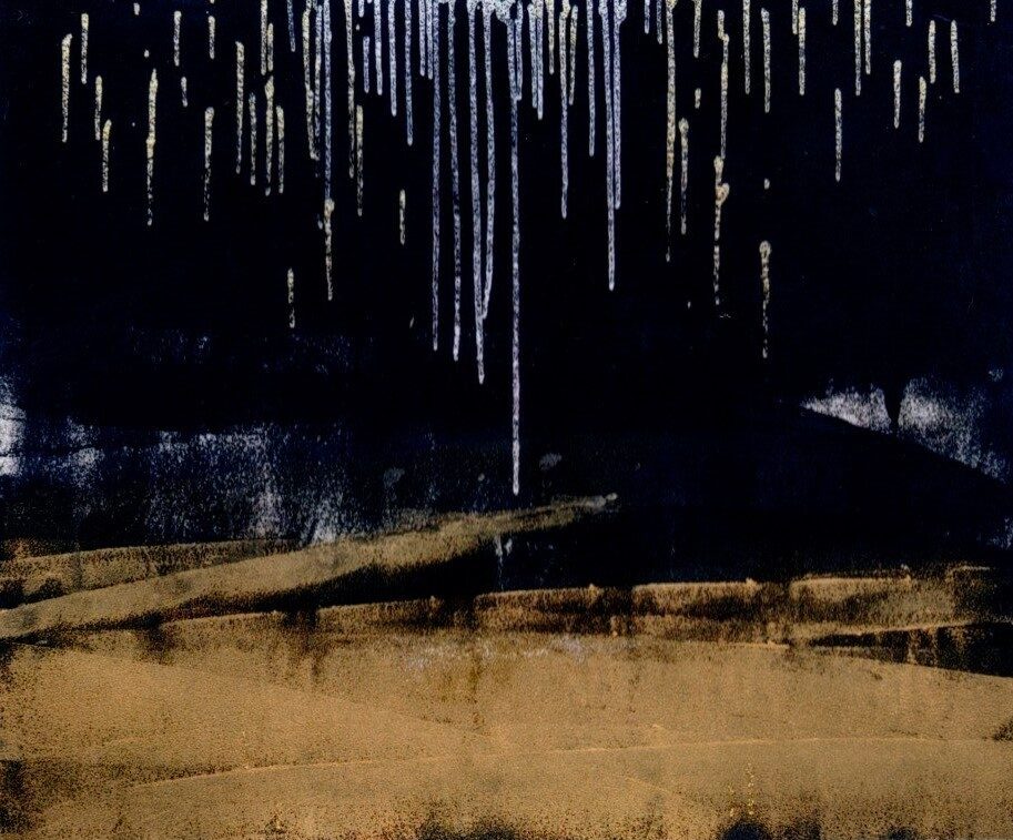 個展のテーマにした「カオス的遍歴」は」パネルにアクリル絵の具で描いた混合技法。金と銀の雨だれのような線がくっついたり、離れたりしている。