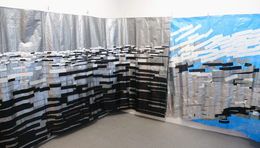 東日本大震災と直後の福島第一原発事故をテーマにした「原子野(げんしや)」は縦180㌢、横500㌢の銀色のシートに反射テープやガムテープを貼りつけている。照明を落とすと反射テープがわずかな光を反射して光り、震災後の計画停電の記憶を蘇らせる。