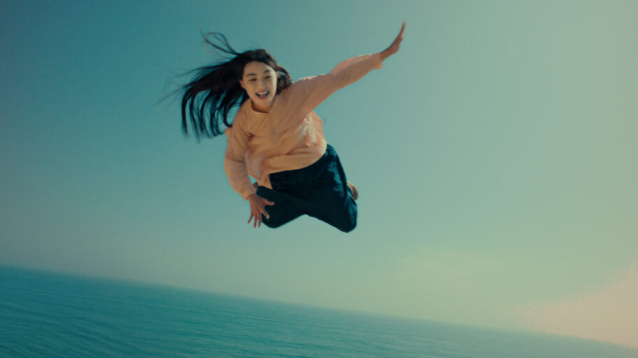 水たまりを軽やかに飛び越えた瞬間、ふわりと身体が浮き、海に向かって大ジャンプ。空を舞う八木さんの笑顔は、まるでテレビ画面を見ている人たちをも空へ連れていってくれるかのよう。