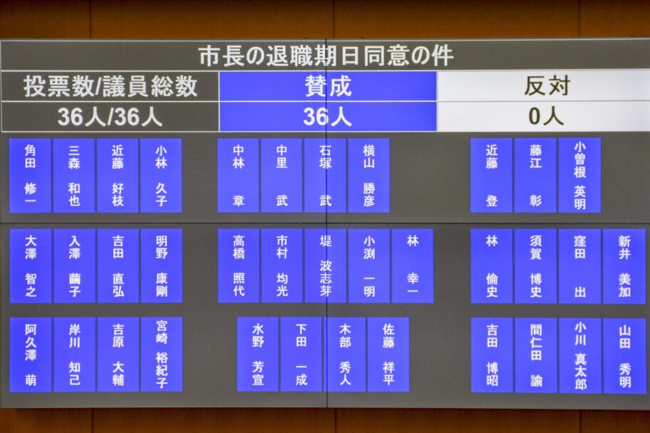 採決では市長支持派を含め全36人が賛成し、辞職が認められた。