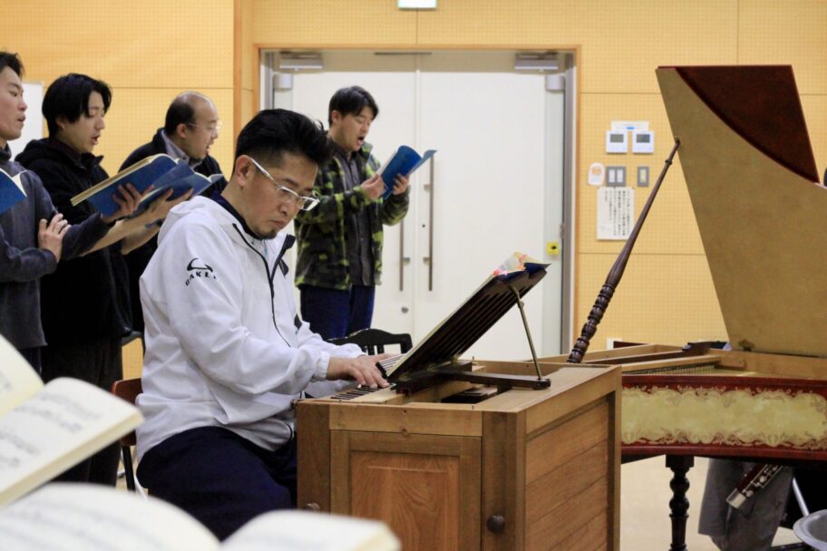 練習では、ラテン語の発音や弦楽器の弓使いなど、バロック音楽ならではの細やかな確認が続く。