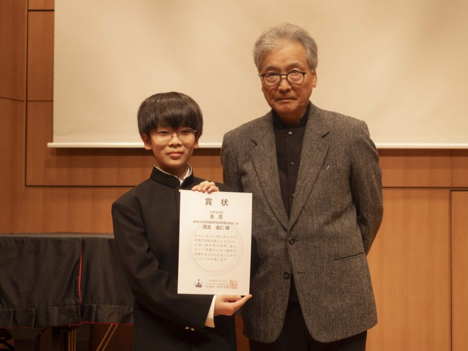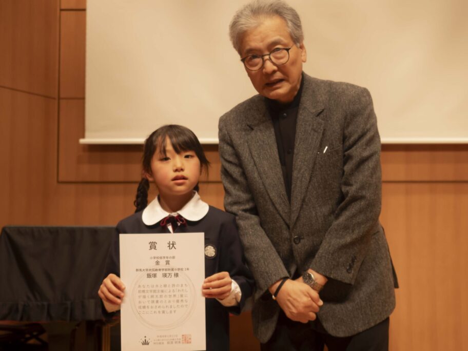 表彰式では、小学校低学年の部、高学年の部、中学生の部で金賞を受賞した児童生徒3人が代表して登壇し、前橋文学館 の萩原朔美特別館長から賞状を授与された。