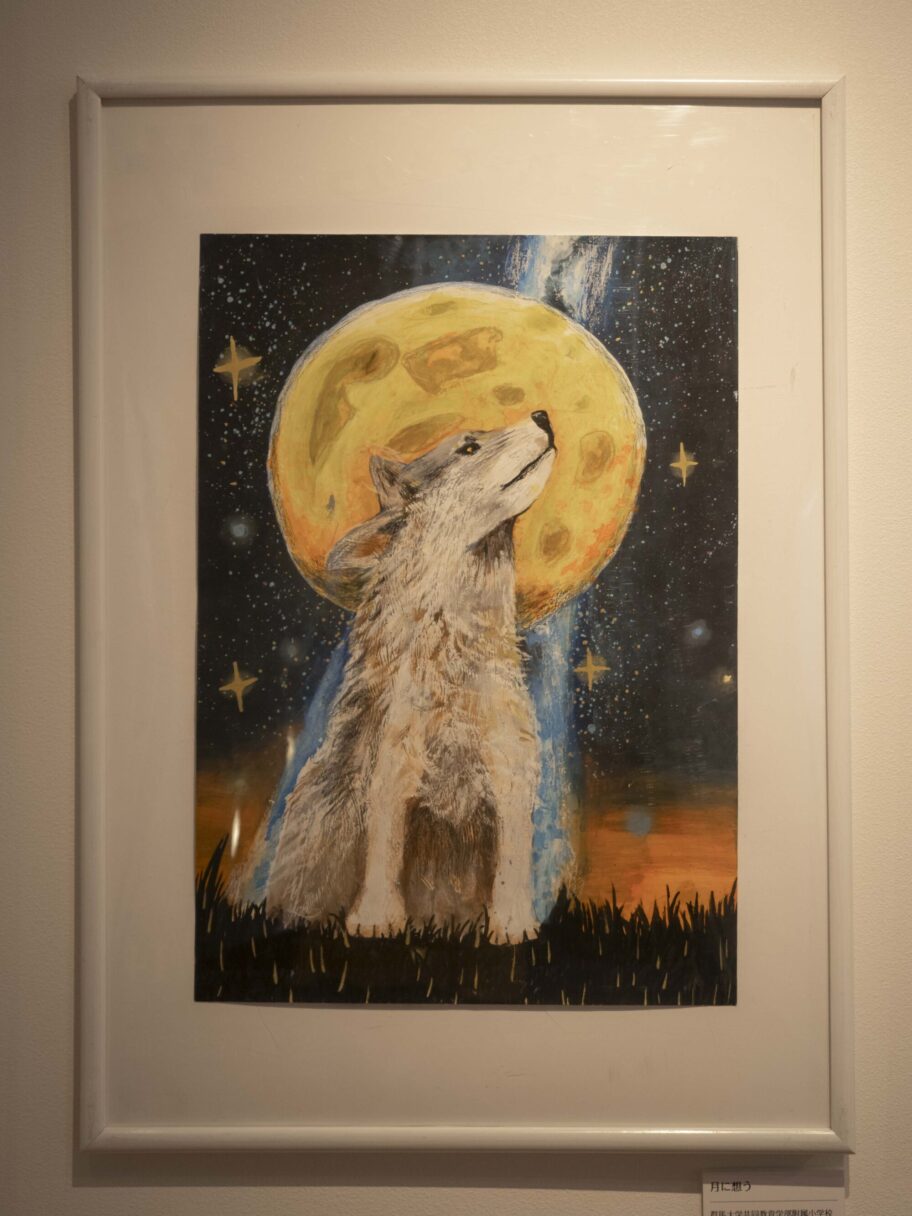 高学年の部の金賞は、同附属小5年の丸山登夢さん。朔太郎の詩「ありあけ」に登場する白犬を描いた作品「月に想う」で受賞した。「白犬が、大好きなオオカミのイメージと重なりました」と制作の背景を語った。
