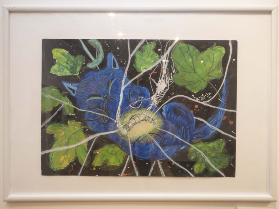 小学校低学年の部で金賞に選ばれたのは、群馬大共同教育学部附属小1年の飯塚瑛万さん。朔太郎の詩「青猫」から着想した作品「生きておくれ ひとりぼっちの青いかげ」で、「飼っている大事な蚕が猫に食べられてしまったところを描きました」と話した。
