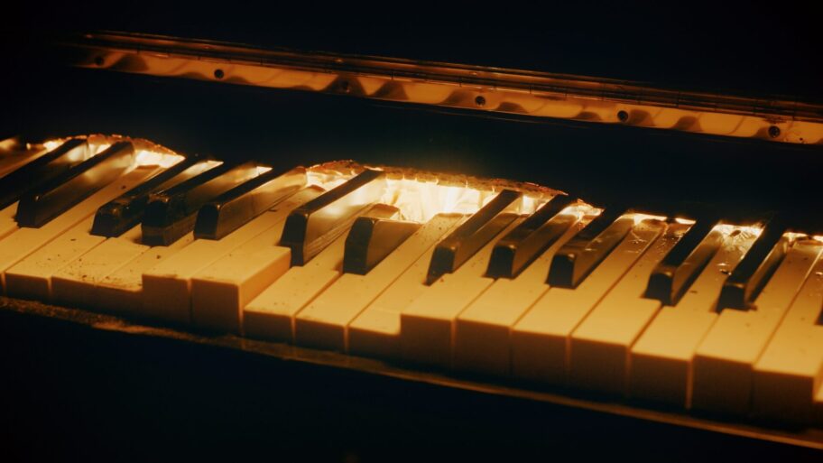 火はピアノから立ち上がるだけではない。そこには、パレスチナ・ガザ地区の戦火や、向井山の故郷・和歌山県新宮市に伝わる御燈りの記憶が重ねられている。炎は個人の感情にとどまらず、現実の世界にある痛みを映し出している。
