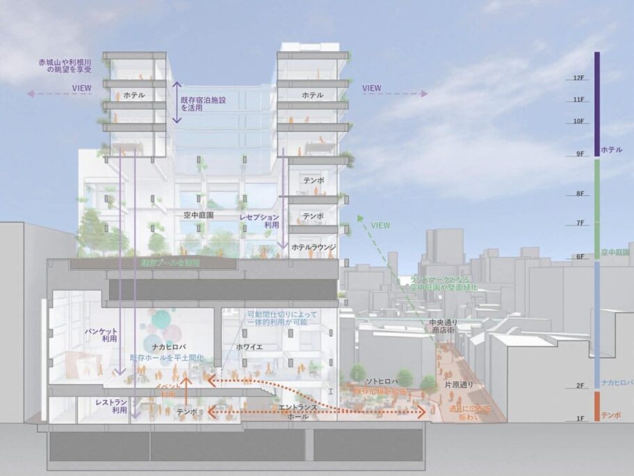 不採択となった大手不動産会社の提案は既存建物を改修、中層部に既存プールを活用した吹き抜けの「空中庭園」を設ける構想で、高層部はホテルとして運営。1階には飲食店舗を導入し、ホールも活用する計画だったという。