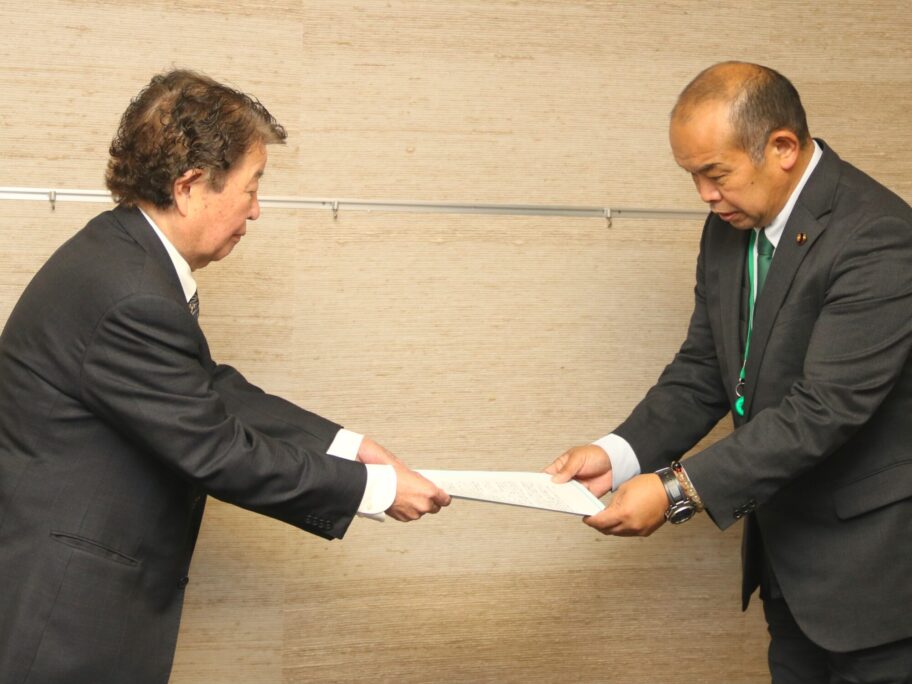 ▲富田市議会議長に要望書を手渡す中心協の植木修理事長(左)