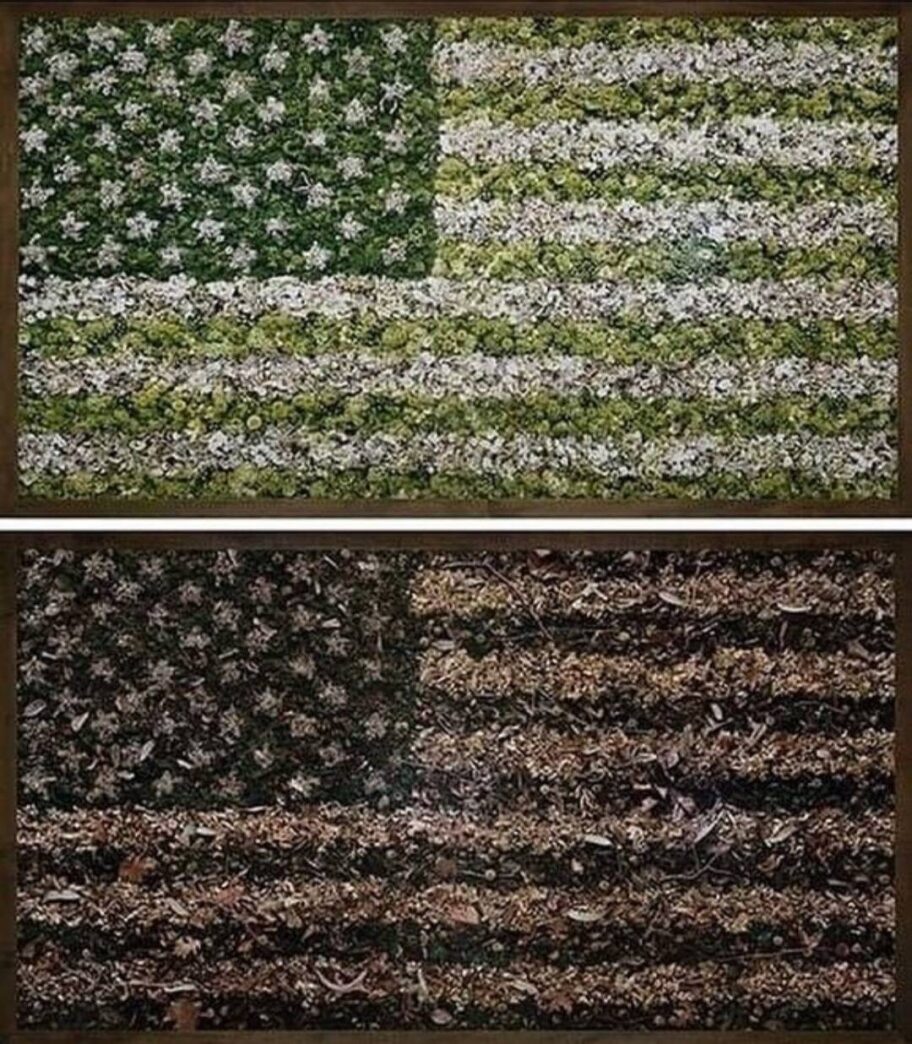 ヴィック・ムニーズは多様な素材で国旗像を組み立て、繁栄と喪失の両義性を浮かび上がらせる。