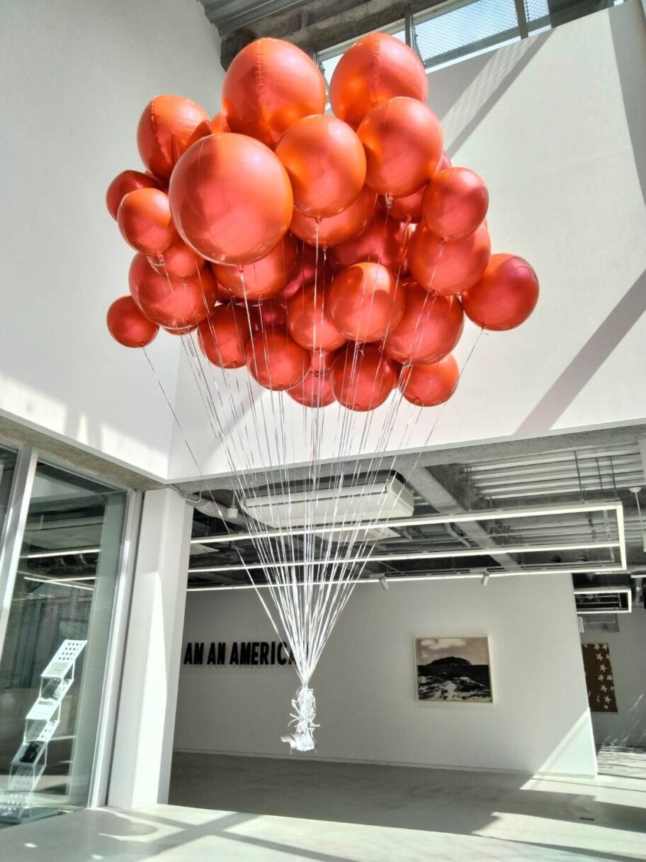 2人の日本人作家の作品も出展する。山田周平はニヒリスティックな思考とユーモアで社会の矛盾を照らす。『アイ・アム・アン・アメリカン』では、日本人である作者が「私はアメリカ人だ」というテキストを提示し、国籍や帰属、アメリカという国家の象徴性を鋭く問う。第二次大戦中の日系人が忠誠を示すために掲げたスローガンを想起させ、排外主義への視線も重ねる。