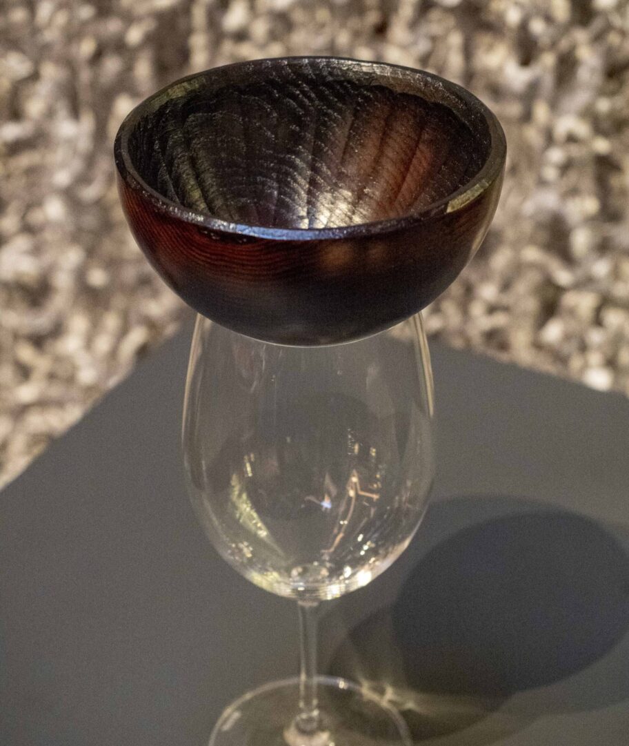 「JO-GO 浄-合」は小さな鉢をワイングラスにかぶせるように置き、ハーブやスパイスを入れると、底の穴から液体がぽたりと落ちる仕組み。片山シェフは「ゲストの目の前でオリジナルドリンクを完成させる新たな道具です」と説明する。